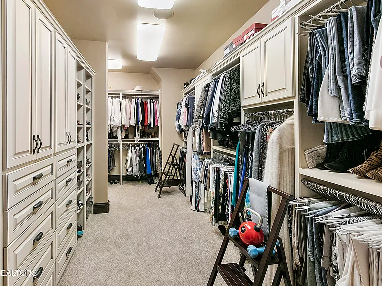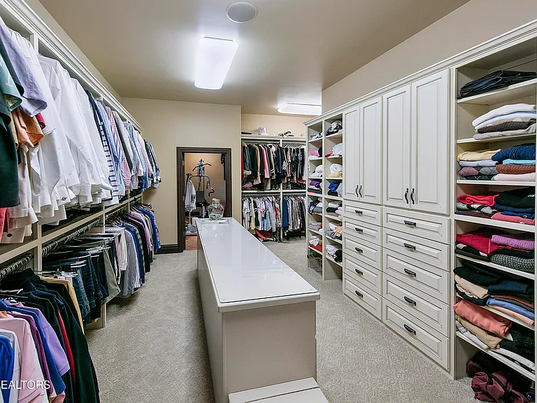 His & her custom closets with built-in island, safe, ironing nook, and built-in refrigerator